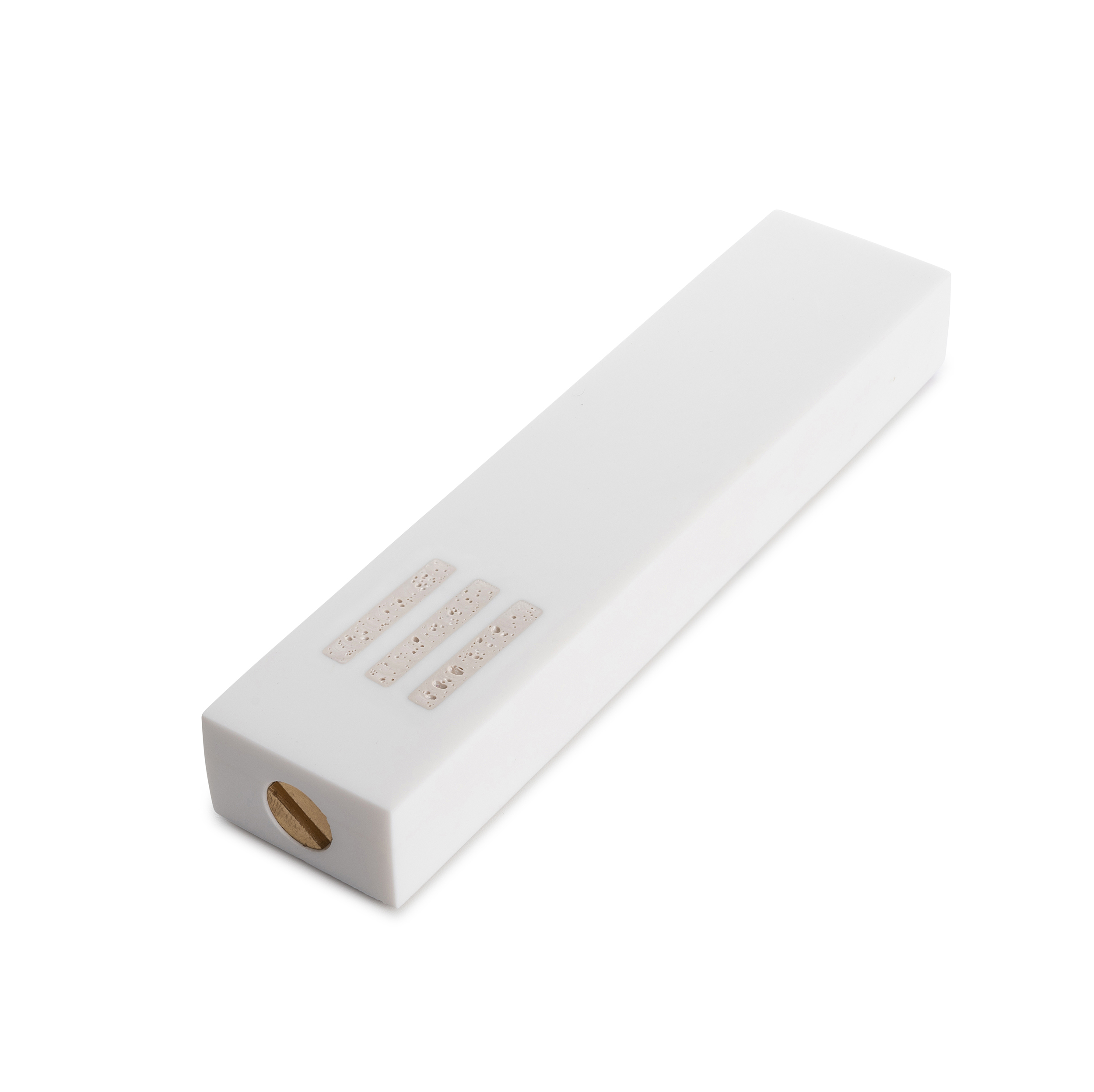 The Mezuzah is handcrafted from Corian that has undergone a meticulous upcycling process, combined with brass elements—