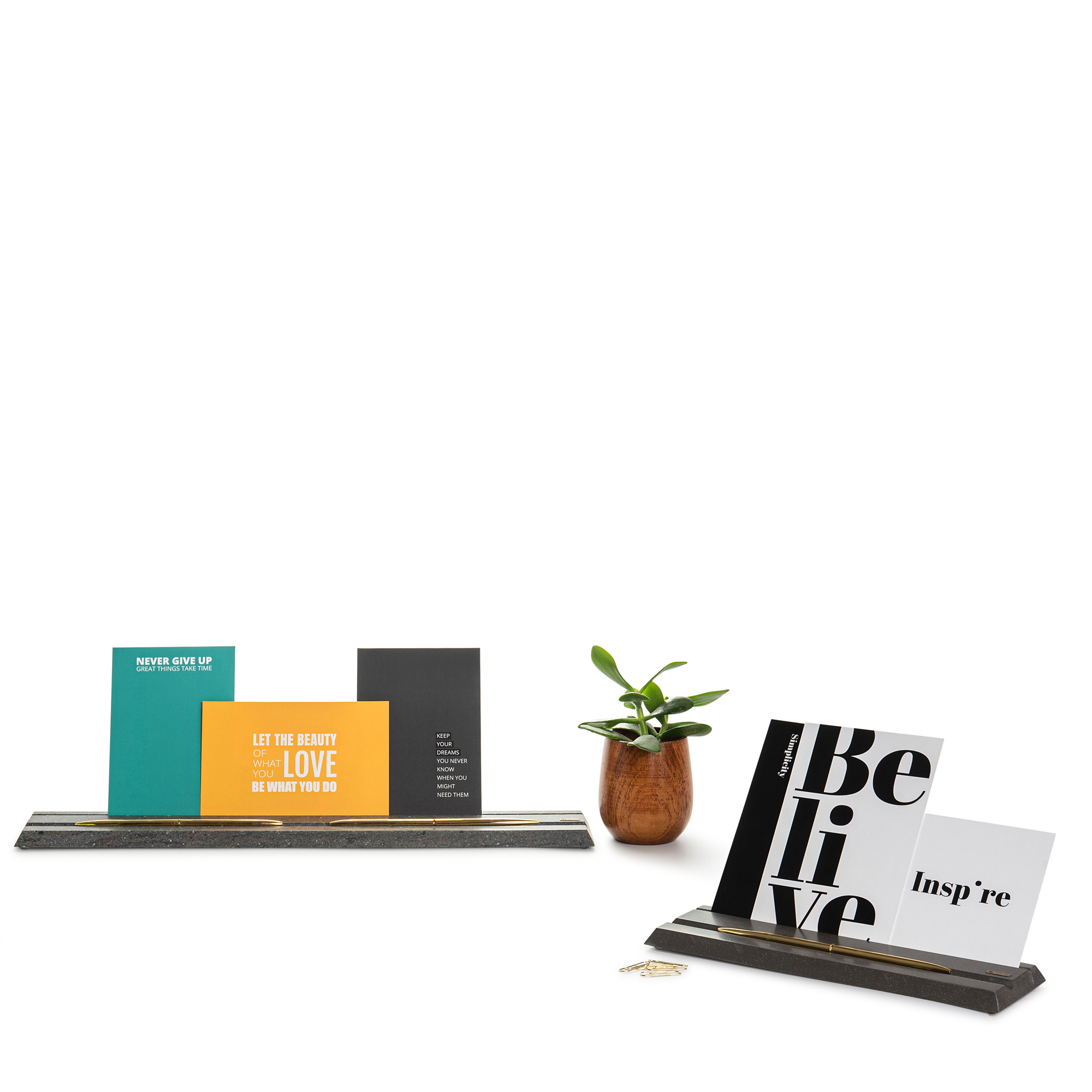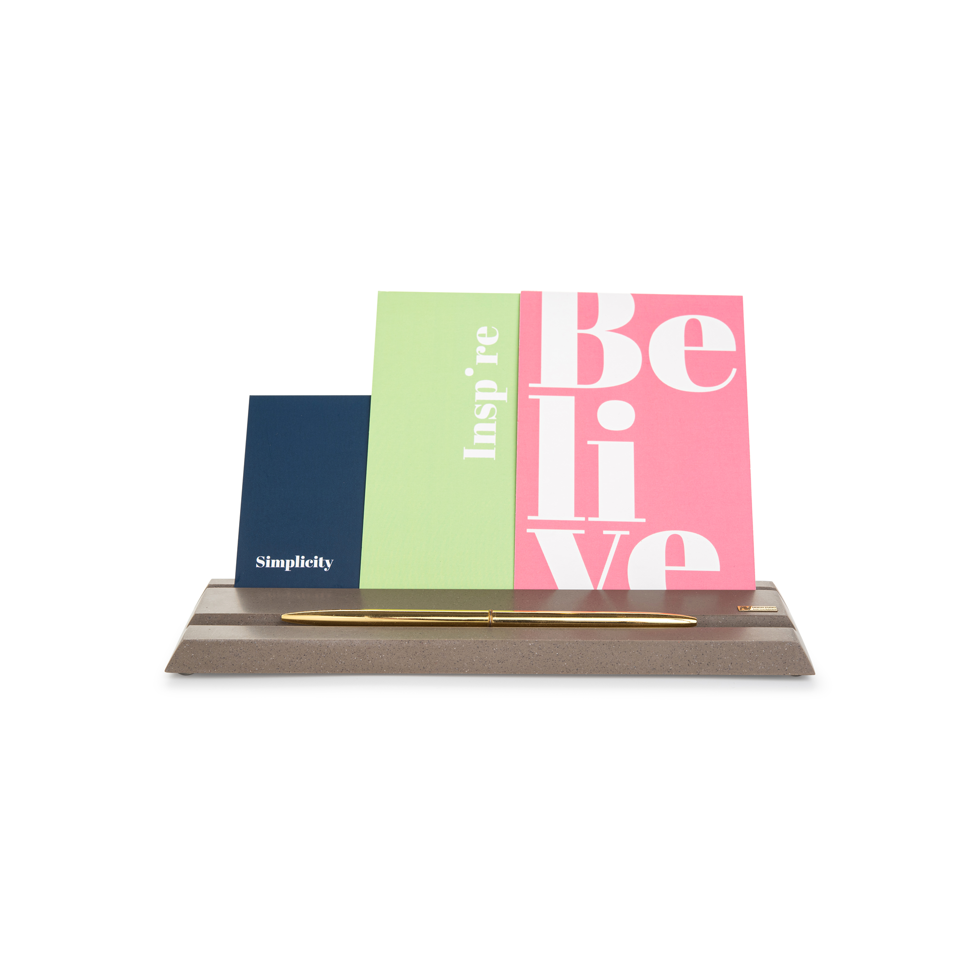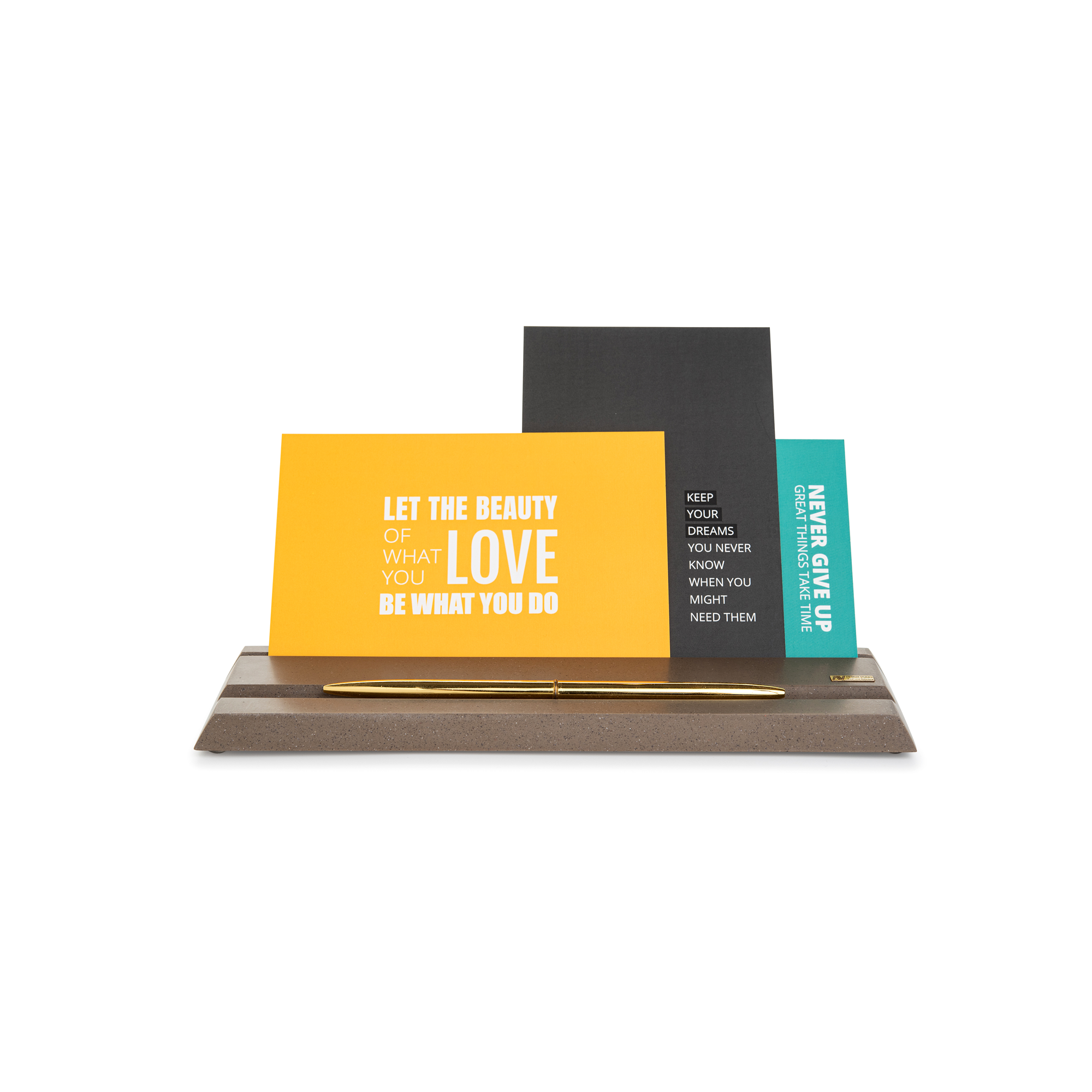 Les supports MAAMAD se caractérisent par un aspect épuré et minimaliste, fabriqués à partir de Corian recyclé à 100%, et sont livrés avec un stylo doré et un ensemble de 3 cartes postales inspirantes.